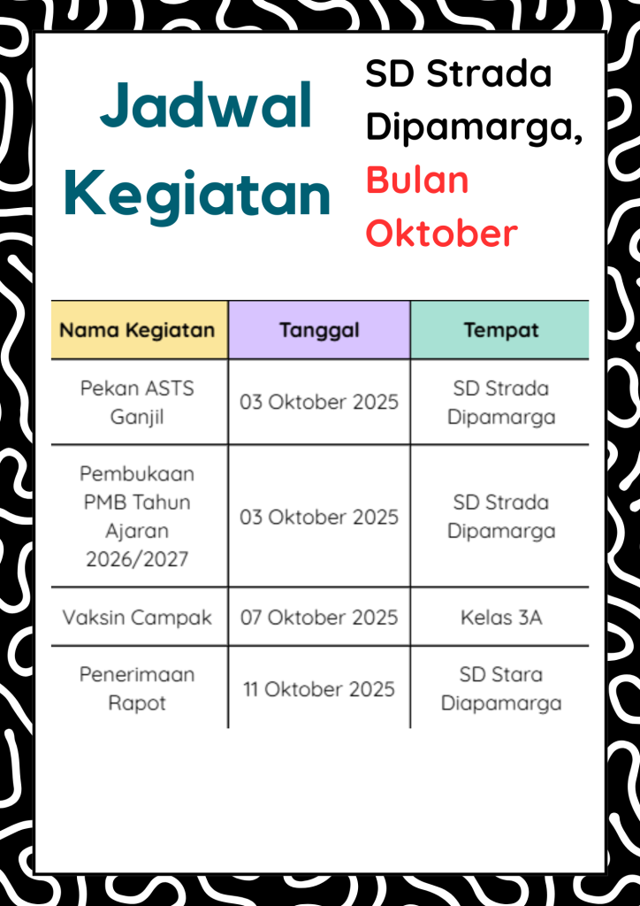 Agenda Bulan Oktober 13 Oct 2025 | Agenda | 0 comments Dilihat: 30 Oktober menjadi bulan penuh semangat bagi keluarga besar SD Strada Dipamarga.Melalui berbagai kegiatan pembelajaran dan aksi nyata, kita belajar untuk terus bertumbuh, berbagi, dan berprestasi bersama. 🌈✨ Sebarkan artikel ini Submit a Comment Cancel replyYour email address will not be published. Required fields are marked *Comment * Name * Email * Website Save my name, email, and website in this browser for the next time I comment.